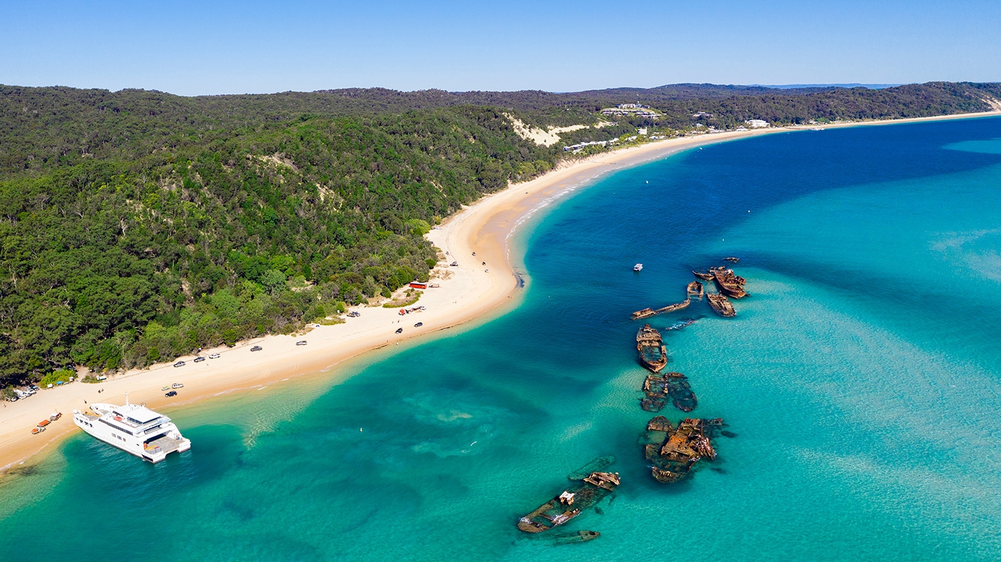 - Aerial views of Tangalooma Wrecks, sand dunes, lagoons and coastline