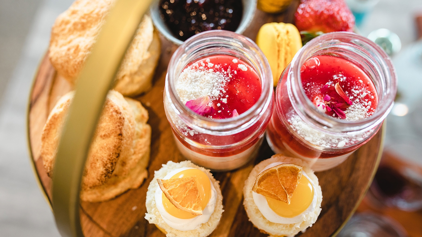 - Tier of sweet items: Mini raspberry cakes made with Cerise gin; scones with gin-infused jam and cream; limoncello infused tartlets; orange and chocolate cookies; and selection of local seasonal fruits
