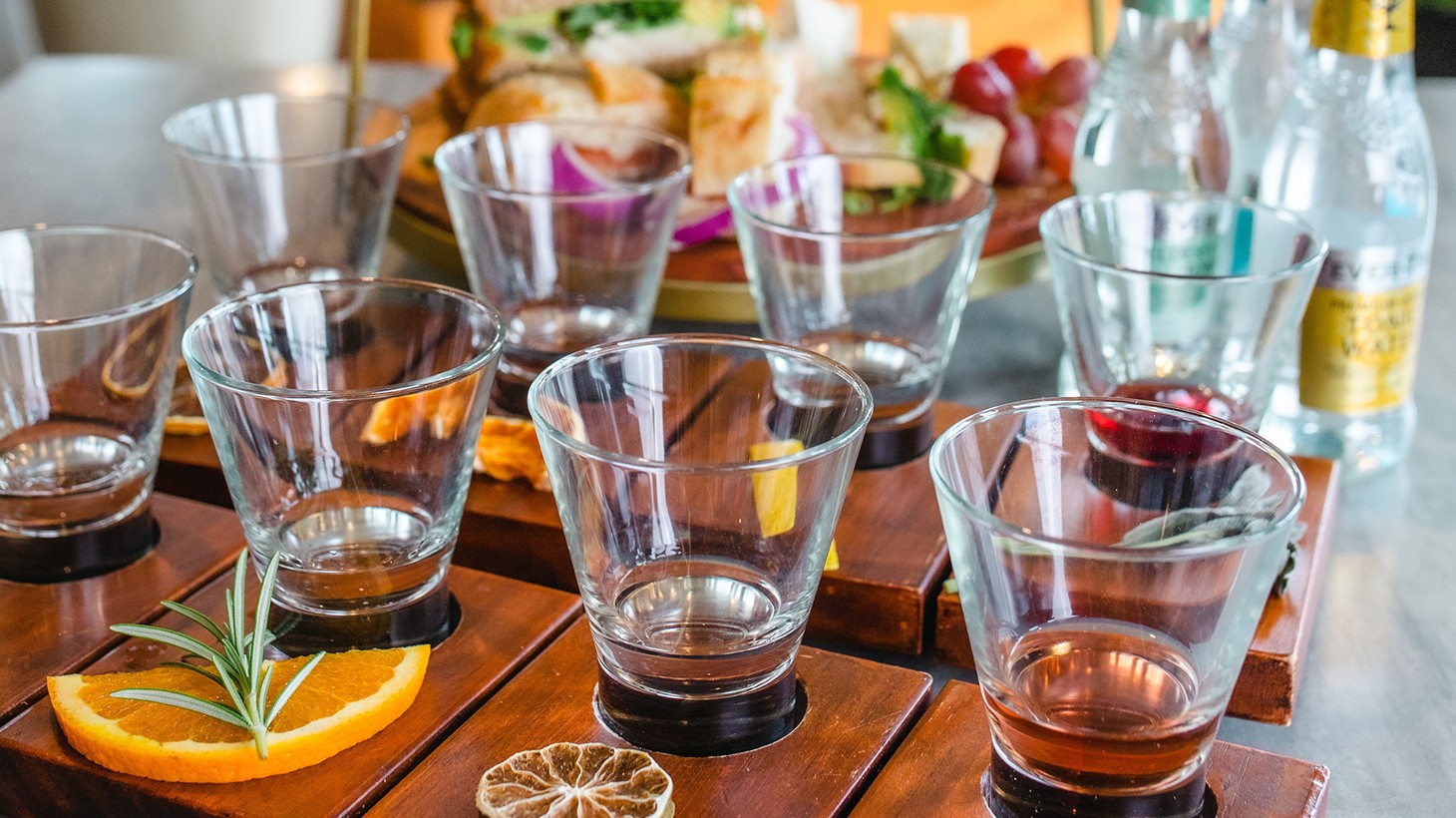 - Choice of gin paddle with four handcrafted gins, tonic and ice to mix your own gins at the table