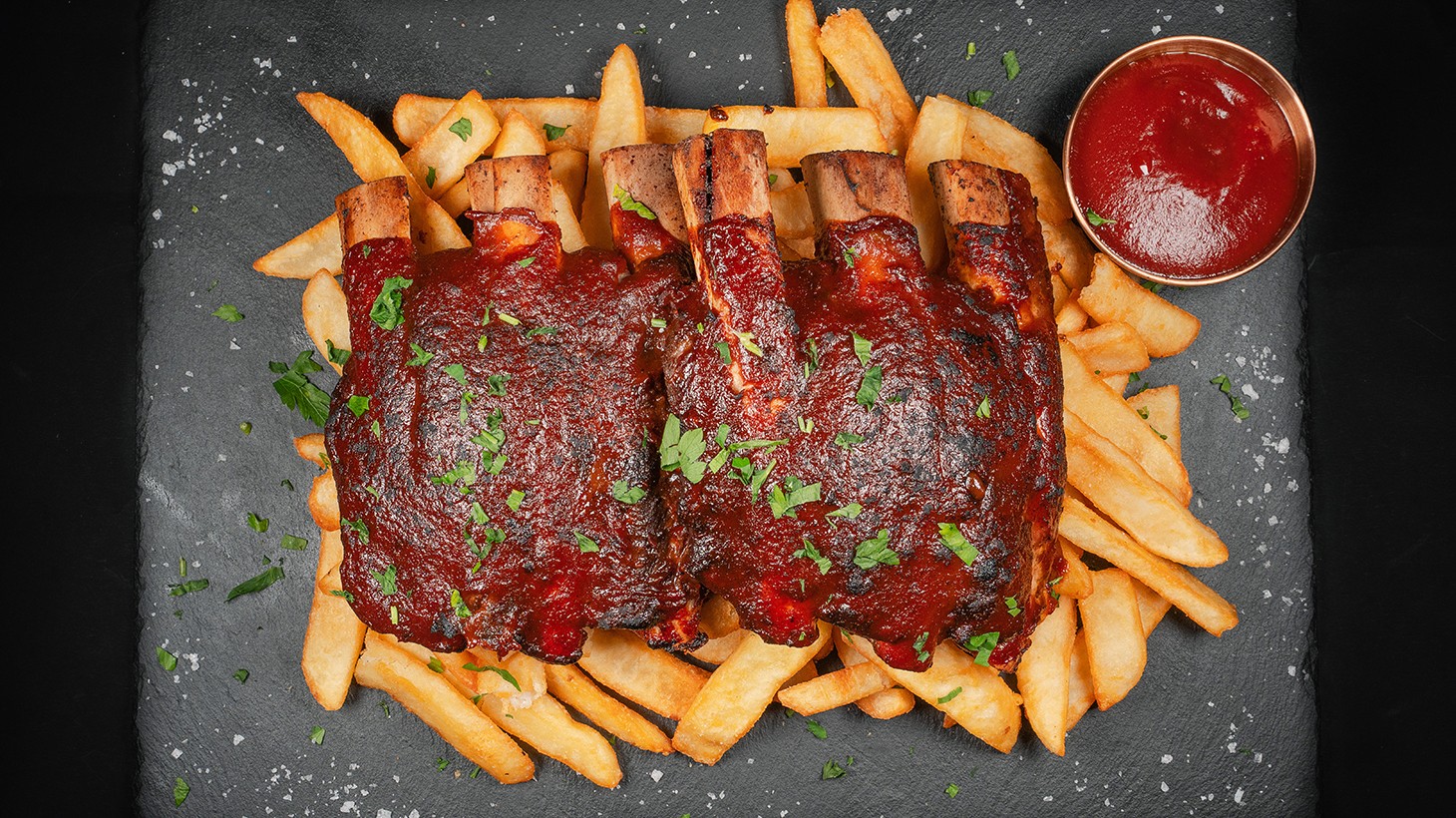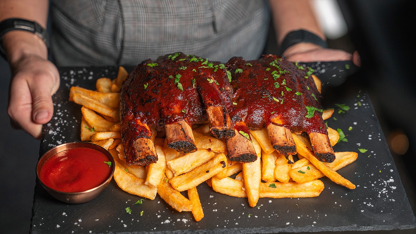 - 1kg rack of beef back ribs on a bed of golden chips