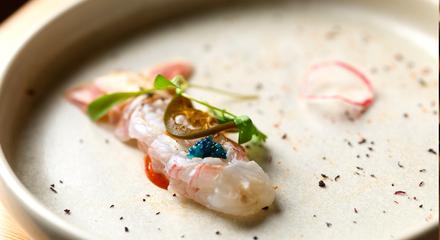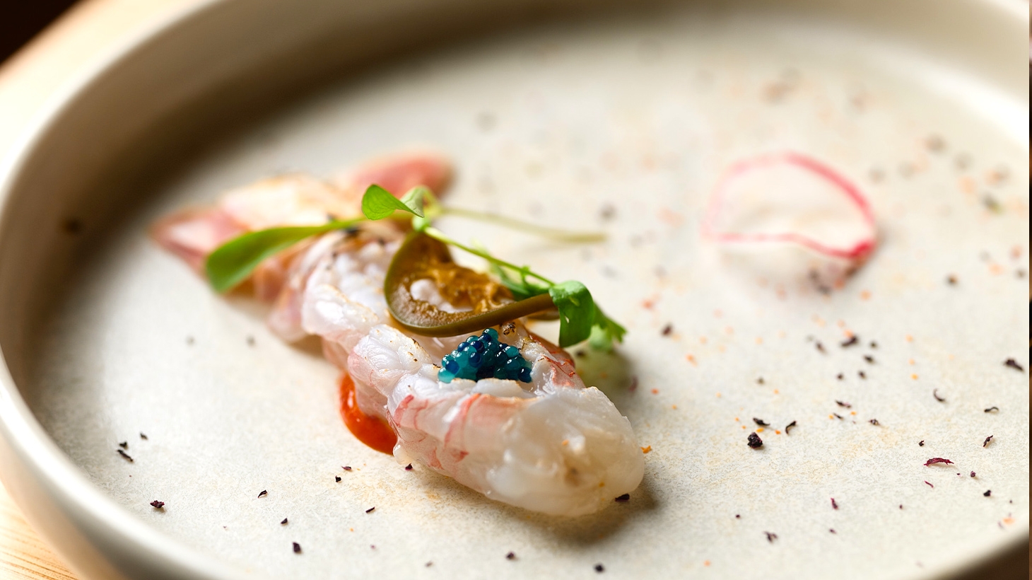- Torch grilled scampi with scampi caviar/finger lime, pickled jalapeno, micro coriander and spicy miso sauce