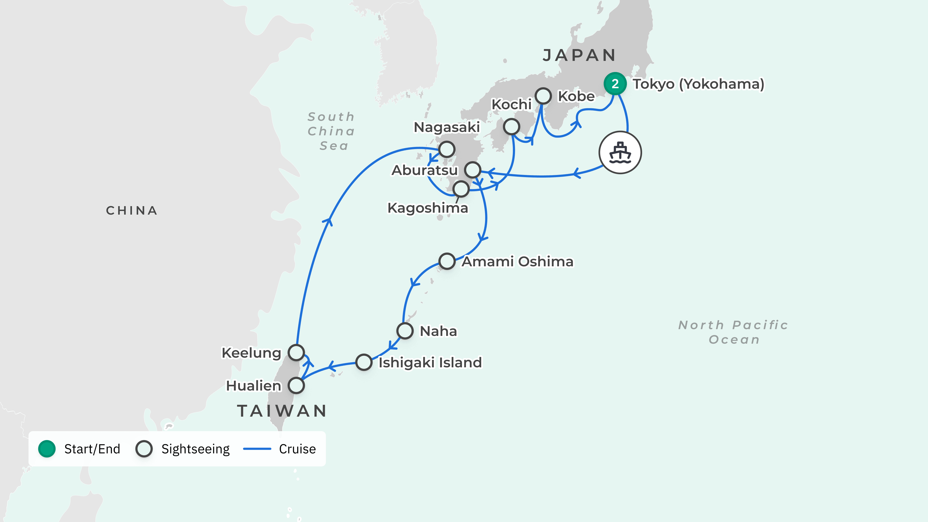 Your journey takes you from Australia to: Tokyo (Yokohama), Japan – Aburatsu – Amami Oshima – Naha – Ishigaki Island – Hualien, Taiwan – Keelung – Nagasaki, Japan – Kagoshima – Kochi – Kobe – Tokyo (Yokohama).
