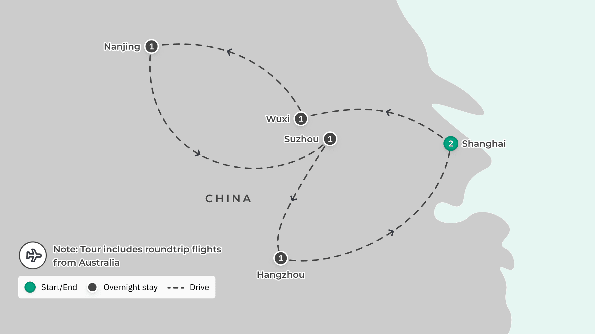 Your journey takes you to: Shanghai – Wuxi – Nanjing – Suzhou – Hangzhou – Shanghai.